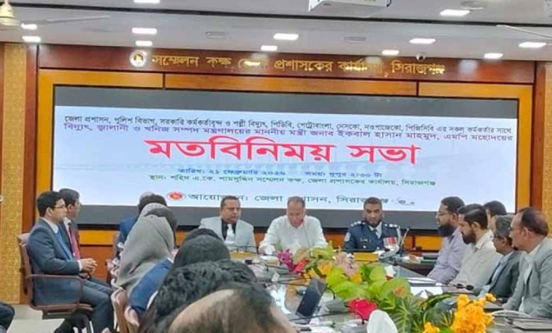 শনিবার (২২ ফেব্রুয়ারি) নিজ নির্বাচনি এলাকা সিরাজগঞ্জে এক মতবিনিময় সভায় তিনি এসব কথা বলেন। মন্ত্রণালয়ের পাঠানো এক সংবাদ বিজ্ঞপ্তিতে এ তথ্য জানানো হয়। সিরাজগঞ্জ জেলা প্রশাসকের সম্মেলনকক্ষে এ সভা অনুষ্ঠিত হয়।