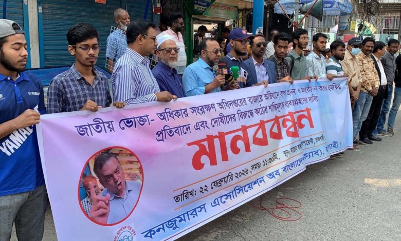 পবিত্র রমজান মাসে বাজার তদারকিতে যাওয়া জাতীয় ভোক্তা অধিকার সংরক্ষণ অধিদফতরের এক নির্বাহী ম্যাজিস্ট্রেটকে হুমকি ও মব সৃষ্টির চেষ্টার প্রতিবাদে রাজশাহীতে মানববন্ধন করেছে কনজ্যুমারস অ্যাসোসিয়েশন অব বাংলাদেশ (ক্যাব)। সংগঠনটির নেতারা এ ঘটনার সঙ্গে জড়িতদের দ্রুত গ্রেফতার ও দৃষ্টান্তমূলক শাস্তির দাবি জানান।