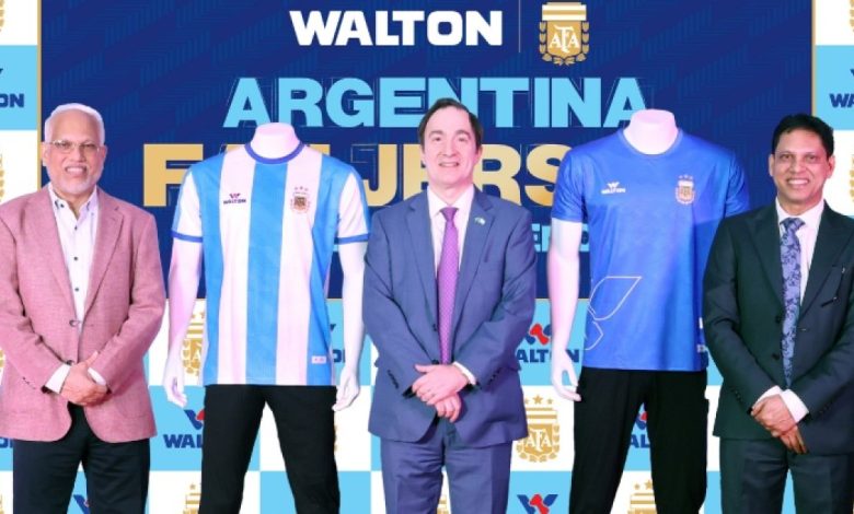 বাংলাদেশের শীর্ষস্থানীয় ইলেকট্রনিক্স জায়ান্ট ওয়ালটন এক জাঁকজমকপূর্ণ অনুষ্ঠানের মাধ্যমে বিশ্বচ্যাম্পিয়ন আর্জেন্টিনা জাতীয় ফুটবল দলের ফ্যান জার্সি উন্মোচন করেছে। সোমবার (২৩ ফেব্রুয়ারি) রাজধানীর ওয়ালটন করপোরেট অফিসে আয়োজিত এ অনুষ্ঠানে প্রধান অতিথি হিসেবে উপস্থিত ছিলেন ঢাকায় নিযুক্ত আর্জেন্টিনার রাষ্ট্রদূত মার্সেলো কার্লোস সেসা। আসন্ন ২০২৬ ফিফা ফুটবল বিশ্বকাপকে সামনে রেখে দেশজুড়ে ওয়ালটনের ক্রেতা ও ফুটবল প্রেমীদের জন্য এই বিশেষ জার্সি বাজারে আনা হয়েছে।