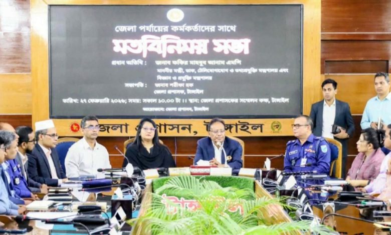 শুক্রবার (২৭ ফেব্রুয়ারি) টাঙ্গাইল জেলা প্রশাসকের সম্মেলন কক্ষে জেলা পর্যায়ের কর্মকর্তাদের সঙ্গে মতবিনিময় সভায় প্রধান অতিথির বক্তব্যে তিনি এসব কথা বলেন। ডাক ও টেলিযোগাযোগ মন্ত্রণালয় থেকে পাঠানো সংবাদ বিজ্ঞপ্তিতে এসব তথ্য জানানো হয়েছে।