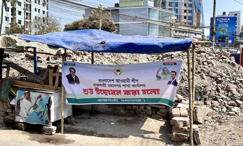 আগেই বুলডোজার দিয়ে গুঁড়িয়ে দেওয়া রাজশাহী মহানগর আওয়ামী লীগের কার্যালয়ের সামনে টানানো একটি ‘উদ্বোধনী’ ব্যানার ঘিরে নতুন করে উত্তেজনা ছড়িয়েছে। শনিবার (২৮ ফেব্রুয়ারি) দুপুরে নগরের কুমারপাড়া এলাকায় ধ্বংসস্তূপের সামনে টাঙানো ব্যানারটি ছিঁড়ে আগুন দিয়ে পুড়িয়ে দেন বিএনপির নেতাকর্মীরা।